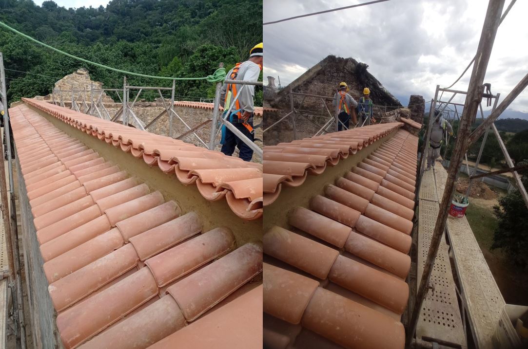 Diante desse cenário, a equipe técnica adotou solução baseada no uso de telhas cerâmicas semelhantes a alguns remanescentes ainda encontrados no próprio edifício. “A escolha buscou respeitar a materialidade original da construção e, ao mesmo tempo, criar uma proteção eficiente contra a infiltração de água”, afirma Jessica Marques.