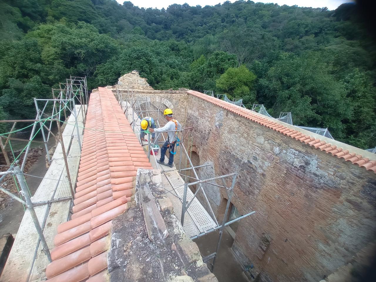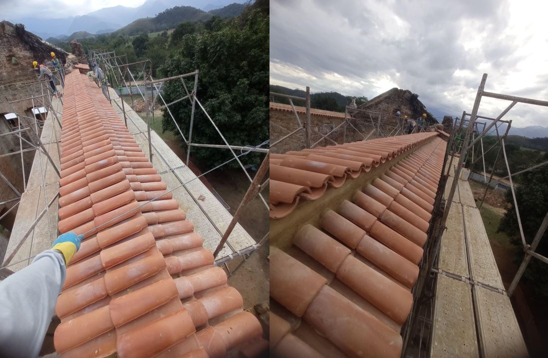 Antes da instalação das telhas, foi necessário retirar completamente a vegetação invasora que havia se espalhado sobre a edificação. Trata-se de uma etapa essencial para permitir o trabalho na estrutura.